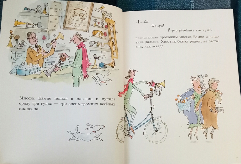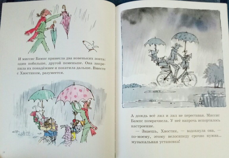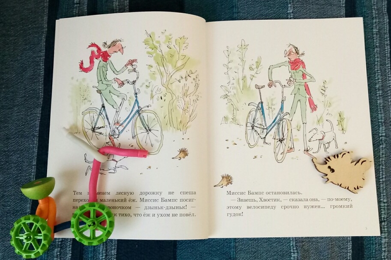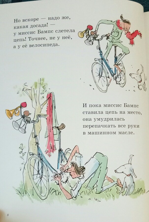 В этой книжке миссис Бампс действует от обратного) если в первой книге ее автомобилю пришлось несладко из за ее небрежного отношения, то к велосипеду она отнеслась более созидательно, хотя результат оказался.. но не будем об этом раньше времени)
