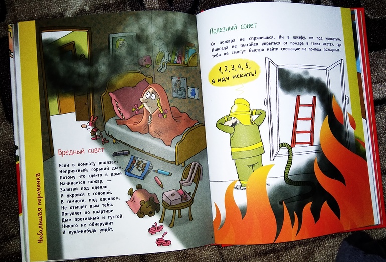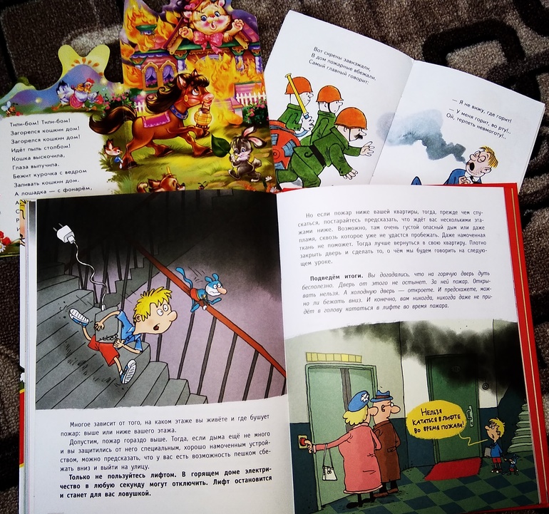 Очень подробно рассмотрена тема поведения при пожаре: данной теме посвящены несколько глав. Для нас взрослых освежить знания оказалось очень полезно. Планы эвакуации дочка теперь ищет и рассматривает в поликлинике, в магазинах) Во всем известной "Тили-бом, загорелся Кошкин дом" дочуля теперь разбирает кто не поддался панике и тушит огонь грамотно: