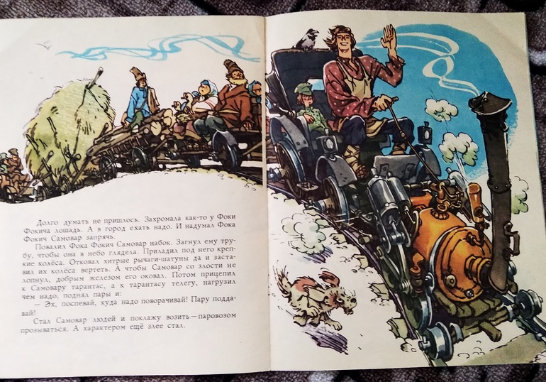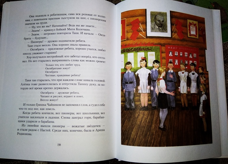 Рисунки Н.Устинова реалистичны, отлично сочетаются с текстом, передают атмосферу деревни, колхозов. Форзац и нахзац - ромашковое поле) Наш дедушка проникся: не хотел останавливаться на прочтении одного рассказа (по одному читаем перед сном). Дедушка поделился своими воспоминаниями, где-то и не очень приятными. Маленькое путешествие во времени нас очень увлекло. Как-то жаль было, что книга подошла к концу. После прочтения дочка смогла сформулировать множество вопросов про детство, школу, про октябрят и вывела бабушку на подробный разговор. Обычно немногословная бабушка наша вспомнила и какого цвета портфели/ранцы были, как в октябрята посвящали, в комсомолы, как в колхозах помогали. Дочка слушала с интересом.
