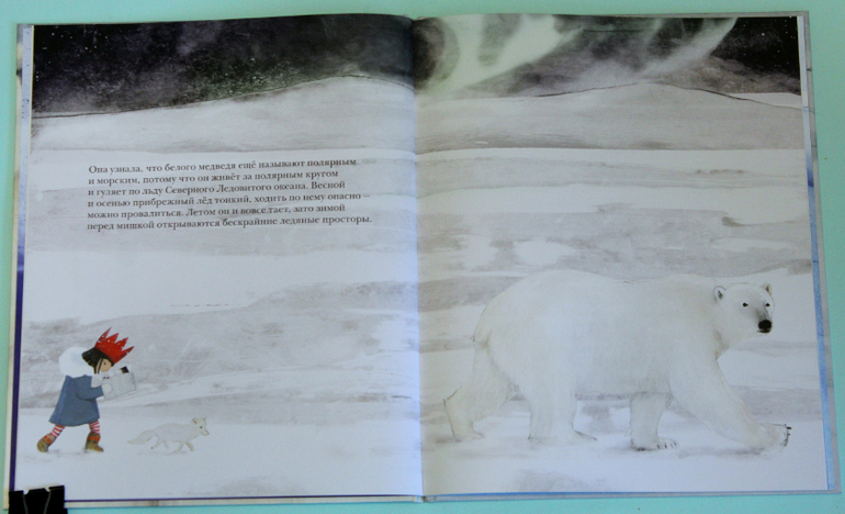 Люблю когда автор сам иллюстрирует книгу, чтобы получилось именно так, как чувствует, как было задумано. У Дженни Десмонда это получается великолепно! Его медведь с обложки так проникновенно смотрел мне в глаза, что я не смогла в очередной раз пройти мимо своей давней хотелки и очень этим довольна.) А внутри книги маленькая девочка берет с полки книгу "Белый медведь" и перемещается в Арктику. Там она наблюдает за медведями, рыбачит с ними, путешествует, а в конце книги засыпает в обнимку с книгой).