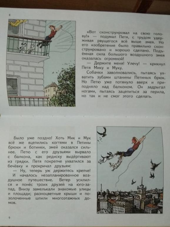 Эта та книга, которая вызвала у меня некоторое негодование и сомнение в покупке других книг серии, хотя может, я придираюсь. Но обо всем по порядку. На каждой странице картинка и текст, шрифт крупный, текста не много, страницы плотные, формат удобный. Сначала мой ребенок рассматривал рисунки и по ним уже мне рассказывал, что там будет. Иллюстрации приятные «советских времен, как и сам текст». Что мне не понравилось? Воровство верблюда, которого потом просто бросили. Конечно, там это не подается как воровство, а называется «честный обмен». Петя отвязал у спящего сотрудника полиции верблюда, причем тот его держал на веревке в руках (то есть точно верблюд был его) и привязал к веревке удава. И спокойно уехал на этом верблюде, при этом еще описывается, как бедный просыпается и очень пугается змее перед глазами. У меня от книги осталось впечатление «мешанины», вот как видит это произведение «взрослый зануда»: воздушный змей донес Петю и его собачек буквально за пол часика до северной Африки. Далее Пете в одежду залез удав, которого они связали и понесли в ближайший город. Петя хотел сдать удава в зоопарк, которого там не оказалась. Тогда он принес его к отделению полиции, увидел спящего полицейского с верблюдом, «поменял» верблюда на змею. Полицейские, которые были на картинке похожи на разбойников, пустились за ним в погоню, но Петю, на ворованном верблюде не догнали. (Зачем Петя это сделал?). Потом они присели отдохнуть на берегу реки, где оказались пушки и военные. От этих военных Пете пришлось снова бежать, то есть уже уплывать через реку, а бедный верблюд был брошен и забыт. И вот беглецов застала ночь, Петя сплел гамак и привязал его к ногам слона, конечно, не специально. Слон утром принес его в деревню, где он познакомился с местными ребятами, которые показали, куда упал его воздушный змей. Там к ним подошел плантатор и грозно спросил, почему чужак отвлекает его работников. На что Петя не растерялся и предложил плантатору чудо-изобретение «воздушный змей», тот его решил протестировал и улетел. (А как мы помним по Пете, плантатор должен быть уже на юге Африки). Дети пришли в деревню и вся деревня пела и плясала два дня. Кстати хочу Вам написать, чем питается «угнетенный народ», вот что предложили гостям: «жаркое из антилопы и копченный окорок зебры; вяленое мясо ската и печенных раков». Потом Петя отправился домой, но уже на лодке, на которой предположительно два дня мальчик плыл, пока не встретил наш корабль. Вот… Я могу в книге «проглотить» многое, но объясните мне, зачем надо было воровать верблюда?(( Может я и придираюсь, ведь дети этого не замечают, но сказать, что так поступать нехорошо, я посчитала для себя обязательным. Если в других книгах такая же мешанина, то, не смотря на очень удобный формат, больше Петю не куплю.