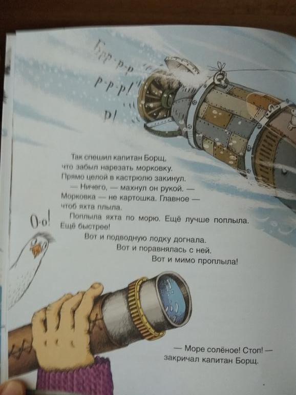 «Мне кажется, что у этой книжки слишком много борща и там все про борщ. Мне очень понравилась. Мне нравится, что там спор с капитанами закончился хорошо. Зря капитан злился, что яхта подружилась с дельфином».