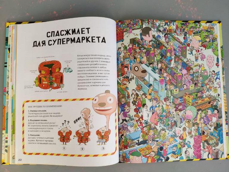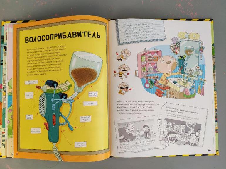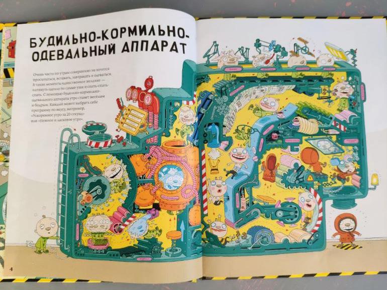 На каждом развороте есть описание изобретения и подробная иллюстрация с кучей мелких деталей, которые и делают книгу похожей на виммельбух. К некоторым изобретениям добавляютя смешные стихи «Устали руки? Не беда! Вставай на ноги и айда!». Это про «шлемосипед» - велосипед, на котором нужно ездит головой вниз и крутить педали руками.