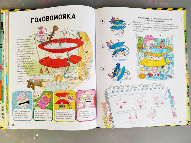 Дочку очень интересует «волосоприбавитель» - но возмущается, что у девочки борода. И любит особенно страницу с «головомойкой» - видимо, потому что сама не любит мыть голову. Кстати, по-моему, такая штука и правда существует: воронка, защищающая глаза от попадания воды в глаза.