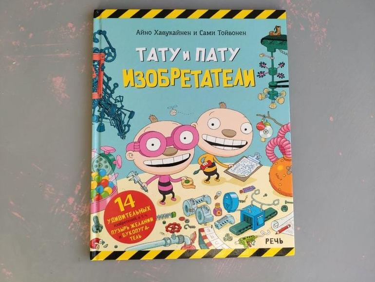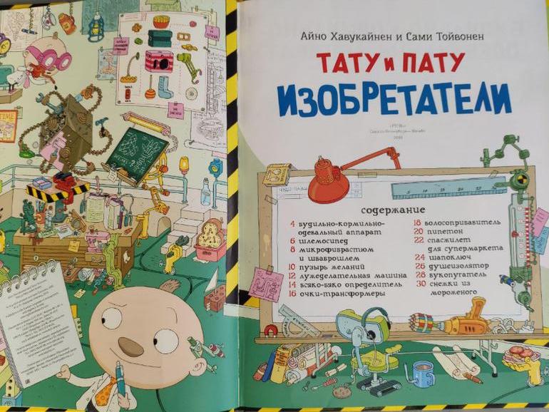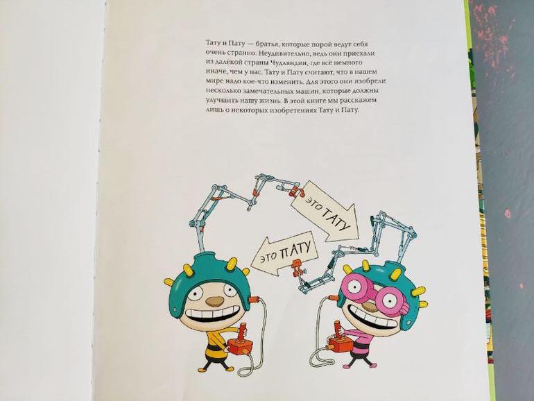 Это что-то среднее между виммельбухом и энциклопедией изобретений человечества (несуществующих 😉). Чудики Тату и Пату нарисованы так, как детям очень нравится - мультяшные, с большими головами, дочка их считает очень милыми. Говорит, Пату похож на пчелку (желто-черный комбез у него), а у Тату очки как у нее (солнечные с розовой дужкой).