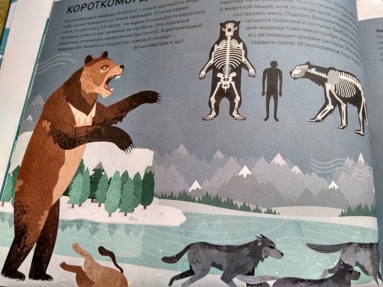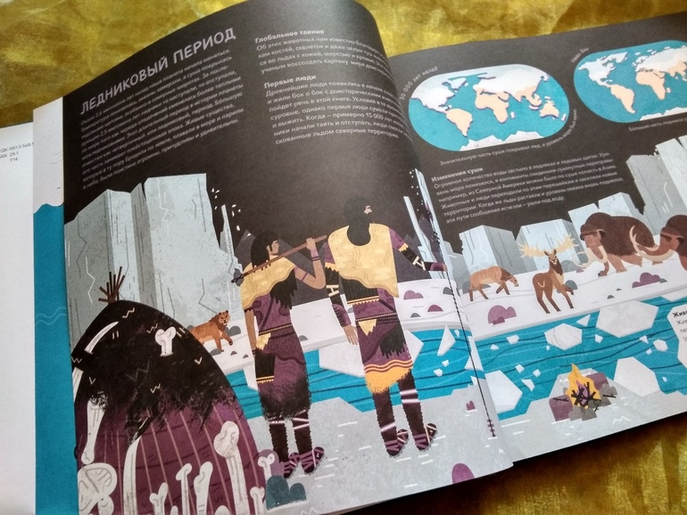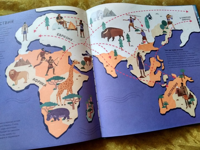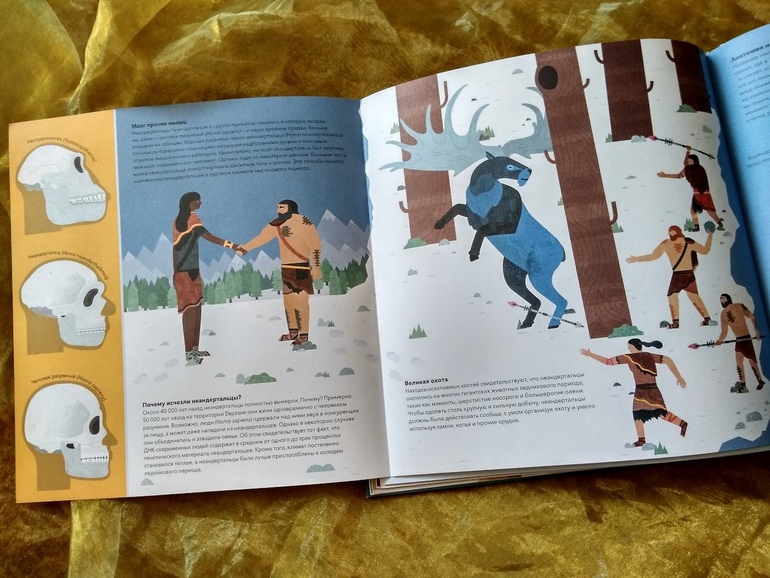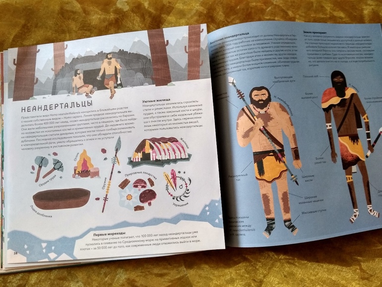 Есть в книге сведения и о предках человека - о неандертальцах с их уютным жильем из костей и шкур, каменными топорами и копьями.