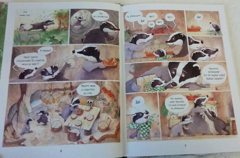 Ну а если не искать терапевтического эффекта от книги, то это просто чудесные истории, местами философские, местами очень озорные, с прелестными, нежными иллюстрациями про то, как пытались ужиться семьи барсуков и лис, как они спорили, ругались, учились плохому и хорошему, мирились, боролись между собой и с внешним врагом, вернее врагами, двумя деревенскимм кошками)