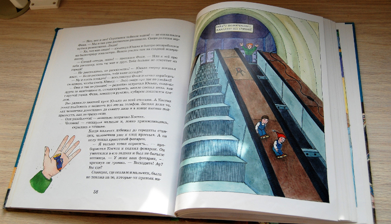 Повесть состоит из 2 частей: одна часть про сказочного человечка Юньку - метрольца, который решает сбежать из своего родного дома Метро и побывать наверху в страшном и загадочном мире людей, куда нельзя выходить. А вторая история про любопытного и непослушного мальчика, который сует нос туда, куда не следует и случайно открывает сказочный мир метрольцев. Истории не разрозненные, в них есть общий персонаж - Юнька. Отличная современная повесть, читается на одном дыхании. Можно сказать, что немного напоминает Фиксиков, но все же это о другом. Еще мне напомнило Волкова с его подземными рудокопами. Детям тоже очень нравится, рисунки можно долго разглядывать.. Как бы не побежали у меня в метро тоже искать дверки :))) Берем уже не первый раз в библиотеке. Купила бы домой, но давно уже нигде нет.