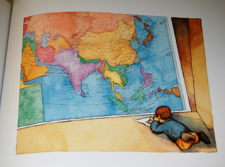 Маша выбрала сама эту книгу в библиотеке. Не знаю, чем она зацепила ее, но я была приятна удивлена дома. Дочь ее не только выбрала сама, но и прочитала дома сама! (к сожалению, с нами это пока редко случается.) Книга отличная. На первый взгляд, ничего особенного в ней нет, текста в ней немного. История о мальчике, семья которого во время Второй Мировой войны эвакуируется, а точнее убегает в чужую страну. Конечно, они живут очень трудно, в лишениях, голоде. Однажды отец уходит на базар за какой-нибудь едой, а возвращается с географической картой....Вот ничего вроде бы нет в этой книге. А она до детей без лишних слов доносит, как это - когда тебе нечего есть, когда у тебя нет игрушек. В послесловии автор рассказывает немного о своей жизни, эта история произошла с ним, родители с ним бежали из Польши и оказались в Туркестане. Не нужно только анализировать книгу с той точки зрения: "А почему они бежали из своей страны, а не защищали ее, потом их семья уехала в Израиль, США." Книга интересна именно с детской стороны. Поступок отца, как отца, важен здесь.