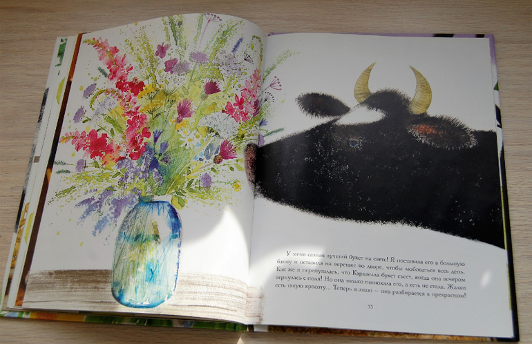 В этой книге мне безумно понравились иллюстрации (если не ошибаюсь, акварель). Очень атмосферно, прямо лето... Ах, яблоки какие на рисунках, полевые цветы, огурцы в банках. Как будто окунаешься в детство. Вот оно у меня было такое: у бабушки в деревне, корова, огород, сено, босыми ногами после летнего дождя... Мои дети корову рядом вообще не видели. Им, наверное, это очень сложно понять. Повесть про лето, девочку, которая живет у бабушки и дедушки в деревне и про корову Каравеллу, потому что она как корабль в зеленом поле травы. Дети слушали, разглядывали, да, таких чувств, как мама, не испытывали, но понравилось :)