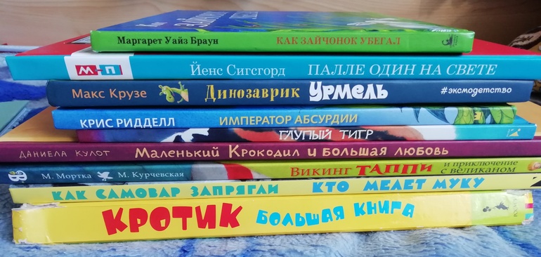 Сын сознательно выбирает книги по-толще, уже не боится большого количества текста на странице) Эх, а я только-только опять стала книжки-картинки покупать, не успела все скупить, что хотела) В основном читает мне вслух, про себя пока редко. Все книги из стопки ему понравились. Императора абсурдии аж два раза подряд прочитал)