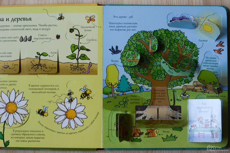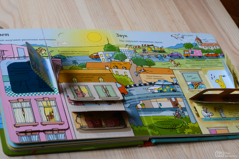 Начну с книги-открытия. Знаменитой серией издательства Робинс удивить кого-нибудь интересующегося крайне сложно. И я, стиснув зубы, выбрала для нас на будущее книги про тело человека, поезда и подводный мир. А потом, в минуту слабости, - и книгу про аэропорт, которая была презентована Леденцу неделю назад и сразу стала хитом-хитищем. Есть у Робинс и книги с окошками про космос, но мне они не особенно понравились. А вот книга Открой тайны науки попросту ускользнула от моего внимания в своё время, и в дом к нам попала почти случайно (взята до кучи в библиотеке). Так вот, скажу я, если бы я выбирала бы единственную, о ужас невыносимый, энциклопедию для дошкольника, я бы выбрала именно её. 110 окошек, включая множество двойных (поэтапных), отличный охват тем и "на сейчас" и "на потом", качество, конечно же. Впрочем, может я зря речи толкаю и просто пока не совсем в теме, но книга мне понравилась несказанно. Не могу не показать развороты: первый о науке, экспериментах (пропускаю). Второй о материалах и их свойствах.