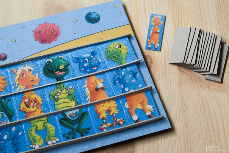 И вновь игра. Mucca Pazza от Ravensburger, давно она томилась в ожидании принтера, и ко дню космонавтики дождалась. ПОиграли совсем чуть-чуть пока, и впечатления сырые, но есть. Арт на любителя, нам нравится: забавный. Есть два режима игры: для 4+ лет (или раньше) и для 6+ лет. Мы играли, разумеется, только в первую версию. Для этого нужна половина поля, половина порезанных на тайлы животных (5 из 10) и половина карточек с животными целыми. Маленькие карточки переворачиваются по очереди, и задачей игрока является за три хода собрать на поле целое нужное животное (на моем фото - конь). Ход - это когда мы убираем один тайл голов/туловища/ног с любого конца и ставим его на противоположный конец. За три хода животное собирается всегда, главное: понимать, какую часть тела в какую сторону выгодно сдвигать. Но это я, взрослая, понимаю. А для трёхлетки задачка не самая простая. В тестовом режиме игры я поняла, что надо будет обучать дочку логике передвижений, чтобы ей было интересно. Но есть подозрения, что она не поймет пока - тогда отложим на месяц-другой. В крайнем случае, поиграем в зверопутаницу пока)))