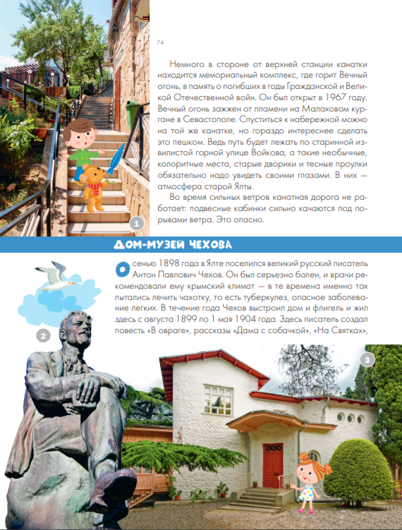 написана Любовью Бросалиной, которая живет в Крыму и увлекается его природой, историей и достопримечательностями. В книге помещены подробные маршруты, длительность и расстояния которых соответствуют возможностям детей и родителей, а тексты содержат ответы на самые частые вопросы юных экскурсантов. Маршруты прошли не только по самым известным и популярным местам Крыма, но и по редким туристическим тропам. Особое внимание в путеводителе обращается на те парки, музеи, памятники и пр., которые вызовут интерес у детей и их родителей. А описания архитектурных памятников соседствуют с легендами и интересными экскурсами в историю, литературу, географию, биологию, что делает путеводитель суперполезным для комплексного развития детей. В путеводитель по Крыму включены интерактивные задания для школьников. Издание проиллюстрировано картами-схемами, фотографиями, яркими рисунками и коллажами.