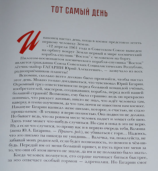 А самое главное, вы сможете узнать обо всех тех нештатных ситуациях, которые происходили не только накануне 12 апреля, но и прямо во время полета. Мне кажется, что именно из-за этих сведений книга и получила категорию "12+". Представляешь всё это в подробностях, и делается страшно, очень страшно... Начинаешь понимать, что освоение космоса - это огромный риск. А в космос летают самые настоящие герои, беззаветно преданные своему делу.