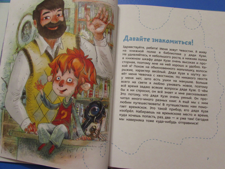 Чевостик это маленький человечек, который живет на книжной полке в библиотеке у дяди Кузи. Вместе с ним они совершают удивительные путешествия в мир наук: физики, химии, астрономии, анатомии, геологии и других.