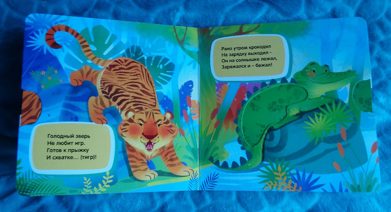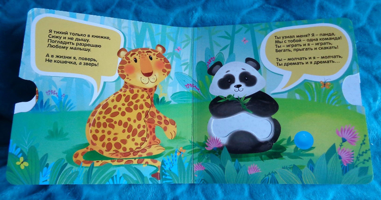 У нас это книжки "Зоопарк" и "Фрукты-овощи". Зоопарк - книга с животными, которых можно увидеть в зоопарке. Есть тигр, леопард, панда, крокодил, лев, обезьянка. Про каждое животное есть небольшой стишок. Стихи незамысловатые, конечно, но ритм выдержан, каких-то грубых ляпов нет.