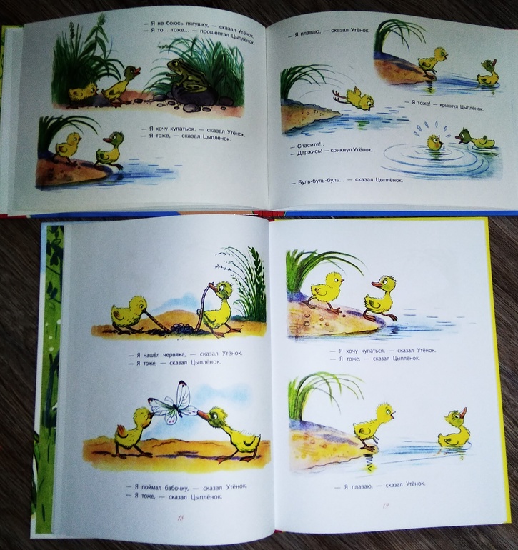 Книги с рисунками Сутеева периодически достаются детьми с полок. Кстати, было замечено, что в большом сборнике опущена встреча героев с лягушкой ("Утёнок и цыпленок"):