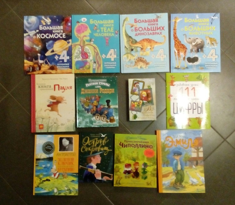 Большие книги о космосе, теле человека, больших динозаврах и больших животных.
