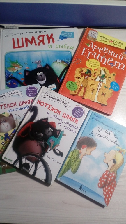 Скоттон Р. Котенок Шмяк - давно я хотела взять эту книгу, тоже для самостоятельного чтения. Вот добыли две книги, потом еще три (такие книги у нас в библиотеке трудно поймать). Конечно, Лида их очень быстро прочитала. Уже поздновато нам, но книги не зря хвалят - смешные и веселые.