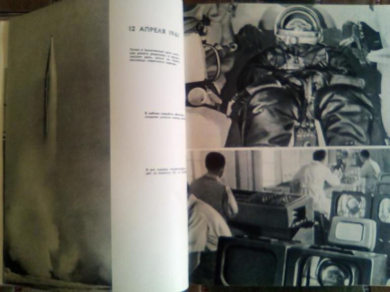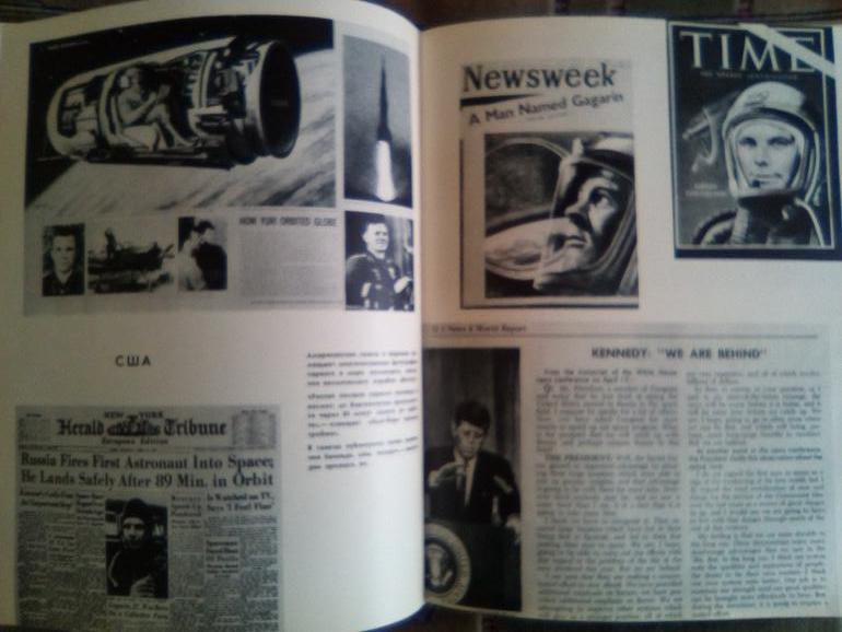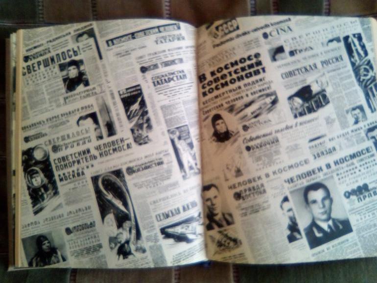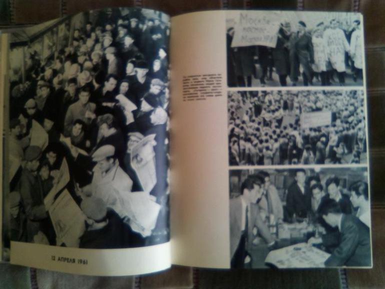 Это уникальная книга - в ней, похоже, ВСЁ о том историческом полёте. Указы, записи митингов, прессконференций, интервью с Гагариным, множество статей на тему из разных газет и журналов, как советских, так и зарубежных, фотографии, письма, и многое другое. Покажу некоторые развороты:
