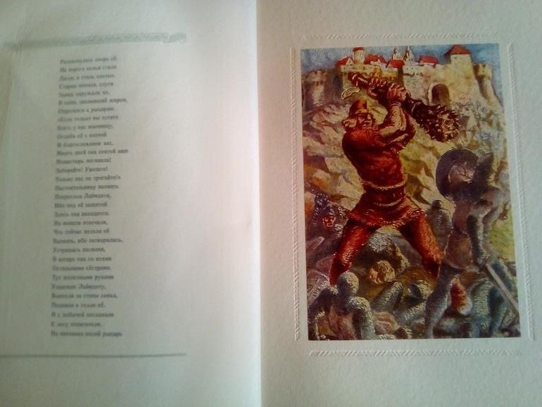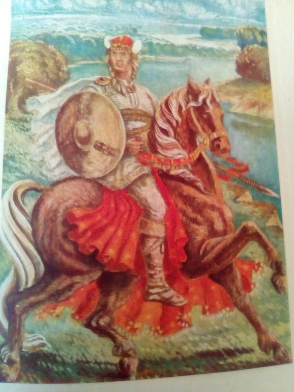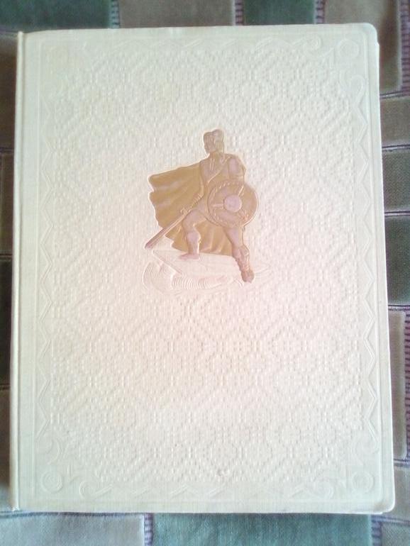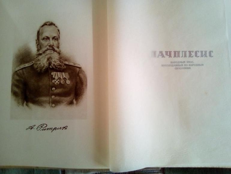 Я выше написала, что "Алпамыс-батыр" - вторая книга эпоса у нас. Покажу уж за одно и первую. Она огромная и тяжелая, издана в Риге в 1948 году. Интересно, что иллюстрации в ней почему-то проложены калькой. Это латышский народный эпос "Лачплесис" (тоже имя главного героя), автор Андрей Пумпур.
