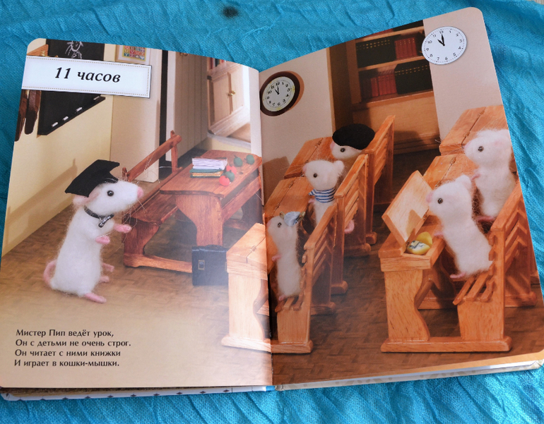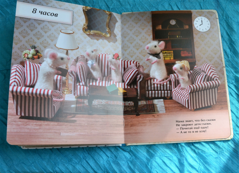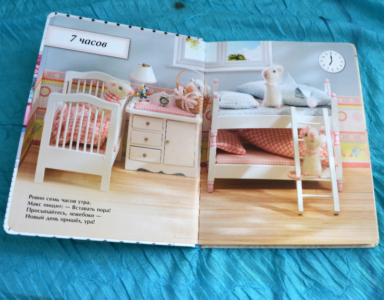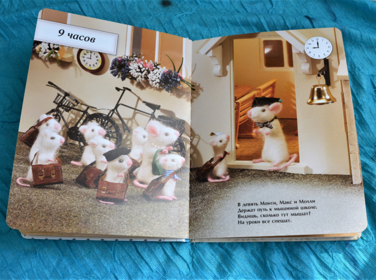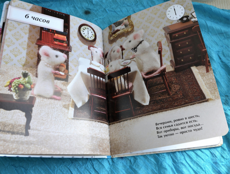 Итак, мышата просыпаются и идут завтракать. Справа на каждом развороте есть часы, можно изучать с ребенком время.