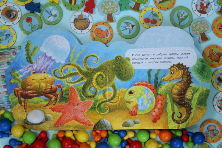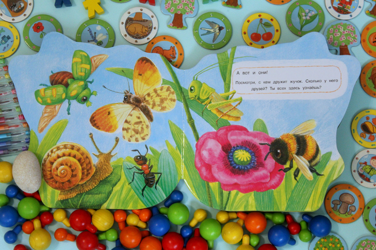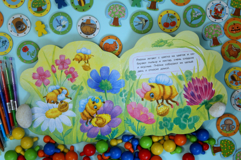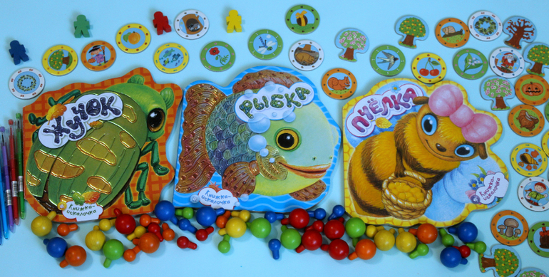 Эти книги сразу привлекли моё внимание. Пыталась себя отговорить от покупки, Настя выросла, до внуков ещё ох как далеко, но хотелось и всё тут. А потом я увидела их в магазине. Приятно удивил размер, он оказался намного больше, чем я предполагала, и оформление обложек приятное: бархатная пчёлка, переливающаяся чешуя у рыбки, гладкий блестящий жучок. Сомнений больше не осталось никаких, тут же оформила заказ. Три книги себе, и столько же на подарки.)) В этой компании ещё цыплёнка не хватает, быстро его разобрали, не успела купить((.