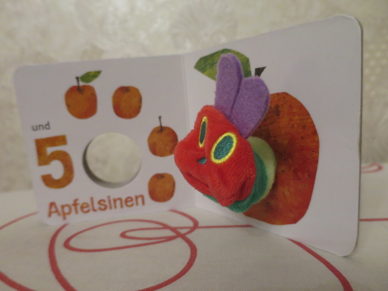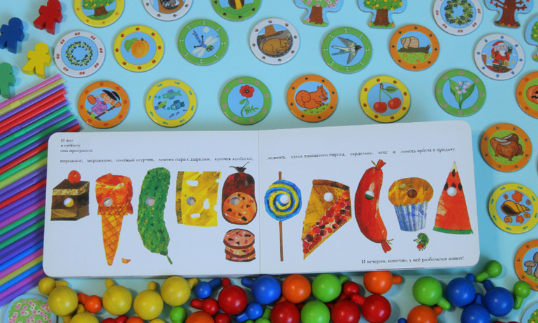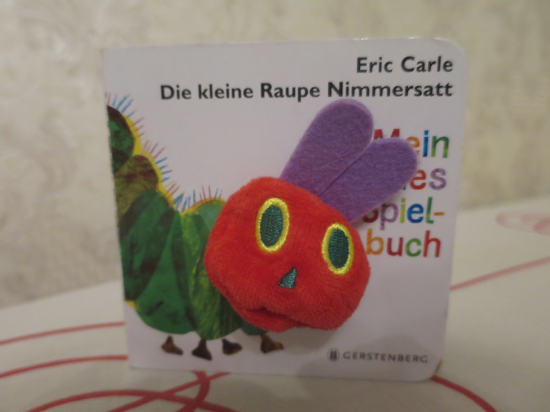 Известная во всем мире прожорливая гусеница. Она точно знает какой-то секрет очарования маленьких деток. Смотрю на книгу, ничего особенного не вижу, но что-то точно упускаю, что-то есть в ней притягательное)). Я только недавно убрала книгу из шкафа в коробку. А то ведь и в 5 лет Настя её брала и читала)).