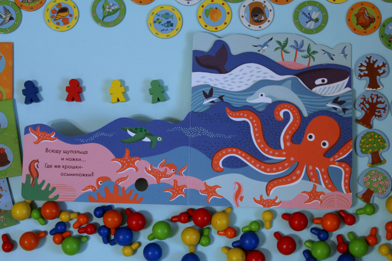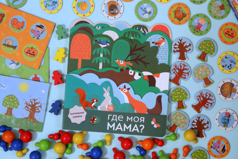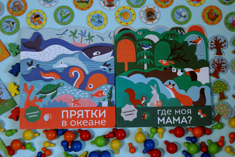 В этих книгах все рисунки тактильные: выпуклые волны, водоросли, рыбки, листочки на деревьях, травка. Главные герои в книгах выделены цветной фольгой. Простой сюжет и буквально по две строчки на разворот - то что нужно малышам! Ведь они не любят подолгу рассматривать картинки, стараются как можно быстрее перевернуть страничку и посмотреть, что же их ждет там? А мама как раз успеет прочесть весь текст.) В книге "Прятки в океане" черепашка встречает на своём пути осьминогов, дельфинов, рыбок, китов и других черепашек. Когда ребеночек немного подрастёт, можно будет не просто знакомится с морскими обитателями, но и считать их. А в книге "Где моя мама" белочка в лесу ищет маму. Сначала она встречает лис, потом медведей, ланей, зайчиков и в конце-концов находит маму. С этой книгой можно будет играть по-другому. Когда юный читатель подрастет, можно будет рассказать про семейства животных в лесу. Папа заяц, мама зайчиха, ребенок - зайчонок и т.д.. Жаль, только на развороте с медведями нет медвежонка.