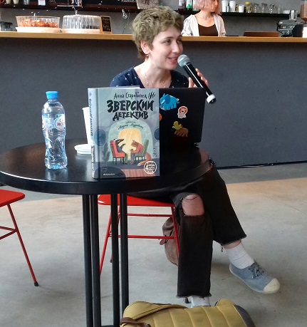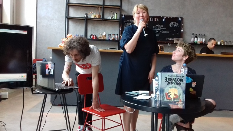 Итак, был представлен буктрейлер книги "Зверский детектив", Анна немного рассказала о книге в целом и предложила послушать главу из ее новой части, где Барсук Старший и Барсукот едут распутывать новое преступление в африканскую саванну. Анна читала, мы, раскрыв рты, слушали, и вдруг она остановилась и сказала: "А дальше я еще не написала". Так что присутствующие стали первыми слушателями главы про путешествие Барсука в желудке черной мамбы...