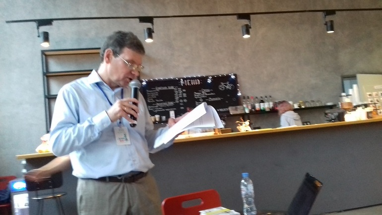 "Я, - говорит,-писатель. Поэтому буду читать по бумажке." И реально всё по бумажке читал! Сначала он очень хвалил Тулу. Вот прямо хвалил-хвалил. Говорит, Тула - город парадоксов. Вот как можно совместить книги и кефир