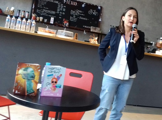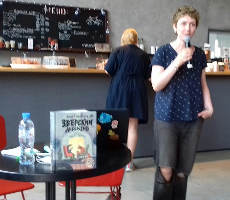 А между прочим, она классная, Евгения Овчинникова. Просто автор еще молодой и мало кому известный. Очень позитивная,эмоциональная. Попросила меня, если что, камеру передвигать, поскольку она не привыкла стоять на одном месте, а любит ходить и размахивать руками.