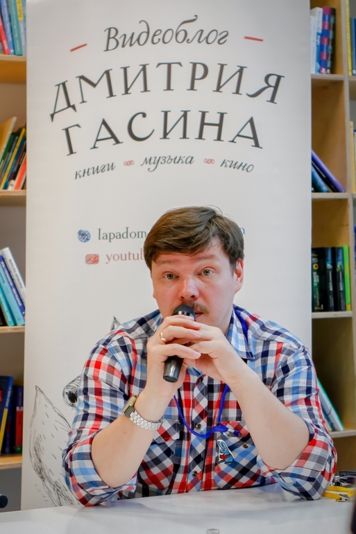 А на смену ей пришла гостья из Петербурга Евгения Овчинникова. И вот тут случилась печалька. Либо время было обеденное, либо гости приходили исключительно на "Зверский детектив". Но площадка опустела. То есть совсем. Нас осталось двое. Евгения и я. Ну не считая практически разоренных работников кафе. В панике я побежала сгонять хоть какой-нибудь народ, но потерпела фиаско. От меня начали шарахаться люди, мирно гуляющие по книжной ярмарке...В конце концов, кое-кто( в основном, работники фестиваля) все же заглянул к нам на огонек. А впереди планеты всей - все тот же неутомимый Дмитрий Гасин, расставляющий вокруг свои камеры.