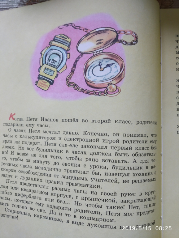 Второкласснику Пете Иванову папа подарил часы. Но Петя мечтал об электронных часах , а подарили какое то старье на цепочке)). Надо заметить, что учился Петя плохо, постоянно просыпал школу,везде опаздывал и отсюда и подарок часы с будильником.