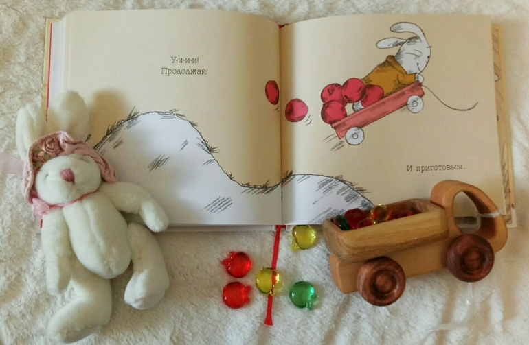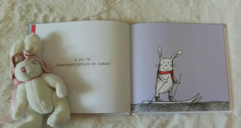 Первую книжку Поехали! Лыжное приключение кролика нам подарили еще зимой. И мой ребенок с удовольствием и смехом помогал незадачливому кролику кататься на лыжах!