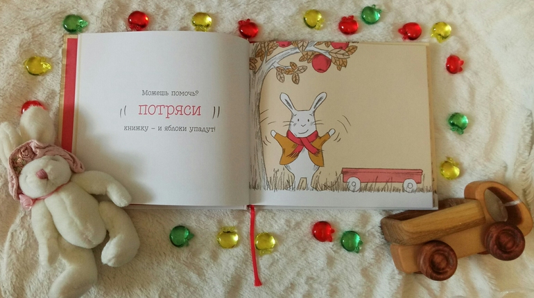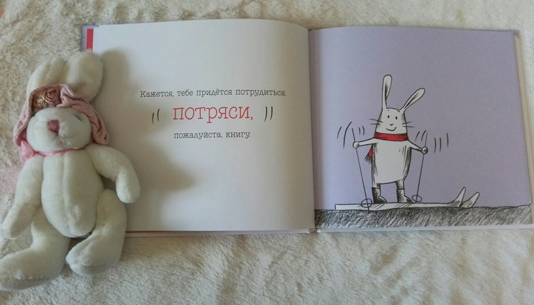 Дети с удовольствием исполняют просьбы кролика Наклони, Сдуй, Потряси) Мой читал вместе с племянницей, оба веселились от души! Только старшая была еще в изумлении, А что, с книжками так можно??! Можно, с некоторыми даже нужно)