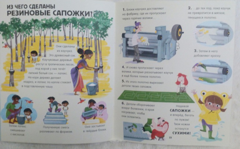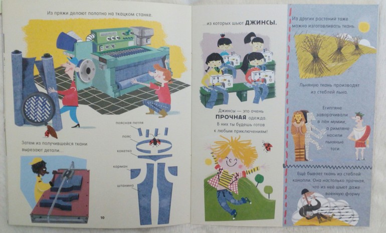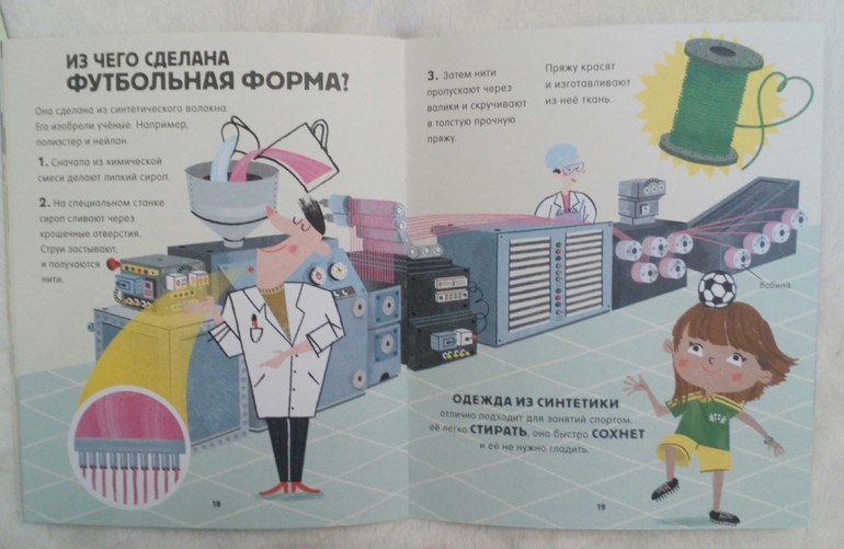 Из книге про одежду мы узнаем, из чего же и как изготавливаются джинсы, футбольная форма, платье, и даже резиновые сапожки!