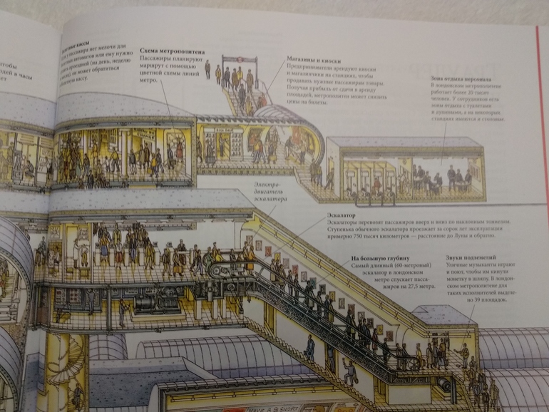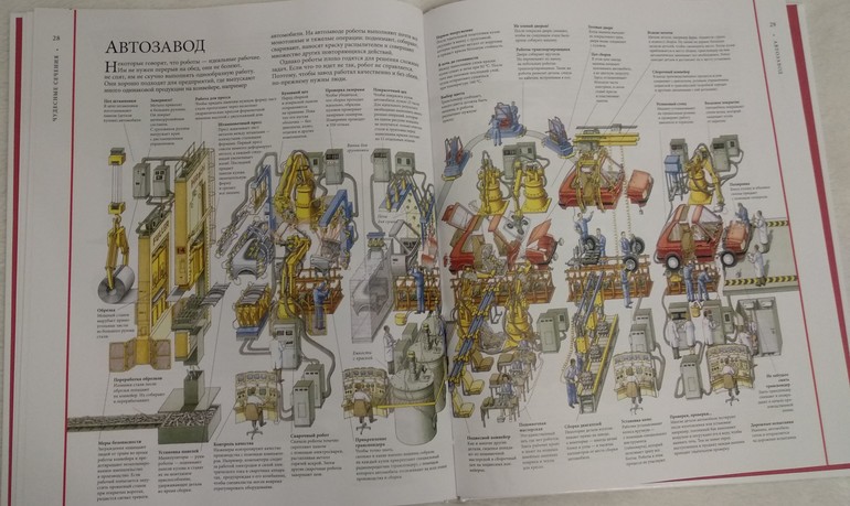 Каждый подробный рисунок снабжен пояснениями, уточнениями и порой интересными и необычными фактами. Книгу брала для сына, и хотя, конечно, ему немного рановато, она его уже не разочаровала! Автозавод впечатлил в первую очередь! Как интересно проследить как из листа железа получаются его любимые машинки)