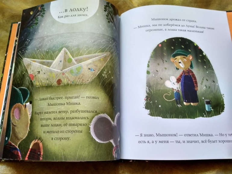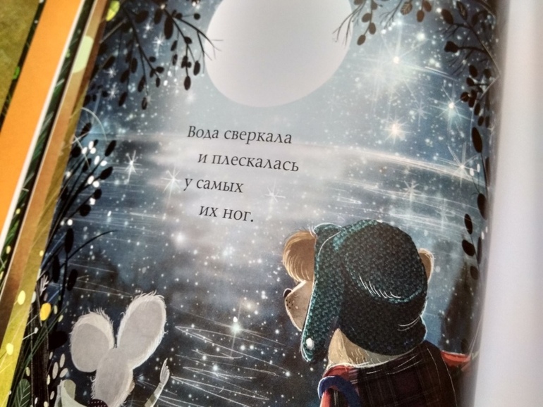 Здесь снова мышки и мишки, кочующие по страницам из книжки в книжку. Мышонок и Мишка, живущие в домике на краю густого леса. Густого-густого леса, в котором от солнца и от луны то светятся, то золотятся, то серебрятся листочки, травинки, веточки, паутинки, качающиеся от ветра. Эти шорохи и блики заполняют все страницы с коротенькой историей.