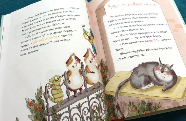 По сюжету: домашние питомцы вдруг научились открывать все двери, это позволило им ходить друг к другу. А вероломное похищение любимого портрета вынудило пушистиков начать расследование. Подозреваемые постоянно появляются новые, но кто злодей и я до конца не понимала. В конце книги вообще опасно становится. )))