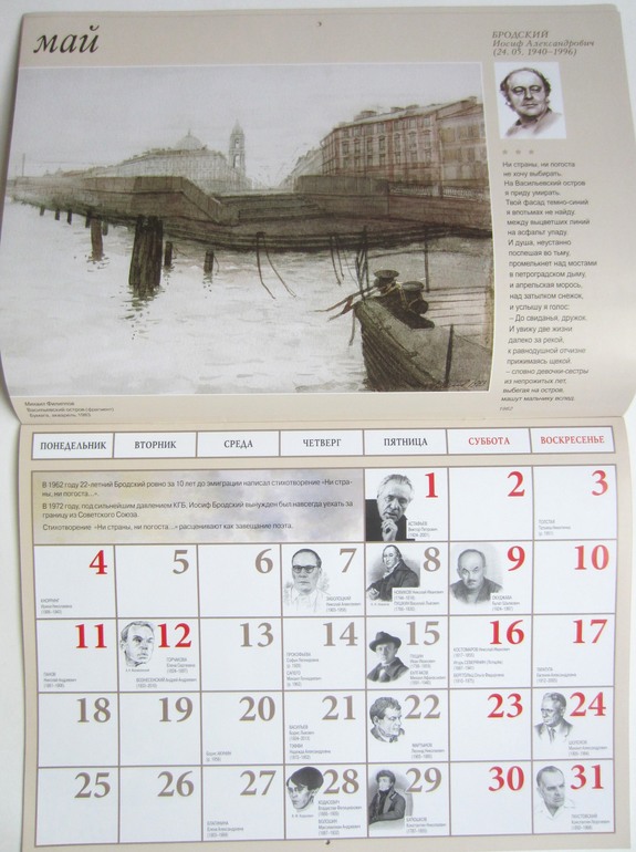 Вверху репродукция картины, это не всегда Петербург, всё подряд, но тематически картина связана со стихотворением, напечатанном сбоку. Стихи русских поэтов 19 и 20 века, поэты не повторяются. На этом же развороте есть всегда краткая информация о стихотворении. Сам календарь с днями рождения поэтов и писателей, часто и с маленькими портретами. В середине календаря есть именной указатель всех. Вот!