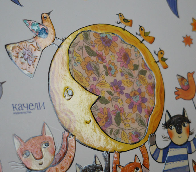 Совершенно фантастически оформлена обложка, с иллюстрациями в стиле пэчворк. Каюсь, я первым делом потрогала яркий цветочный узор, чтобы проверить, не тканевый ли там кусочек, внутри Луны. :)