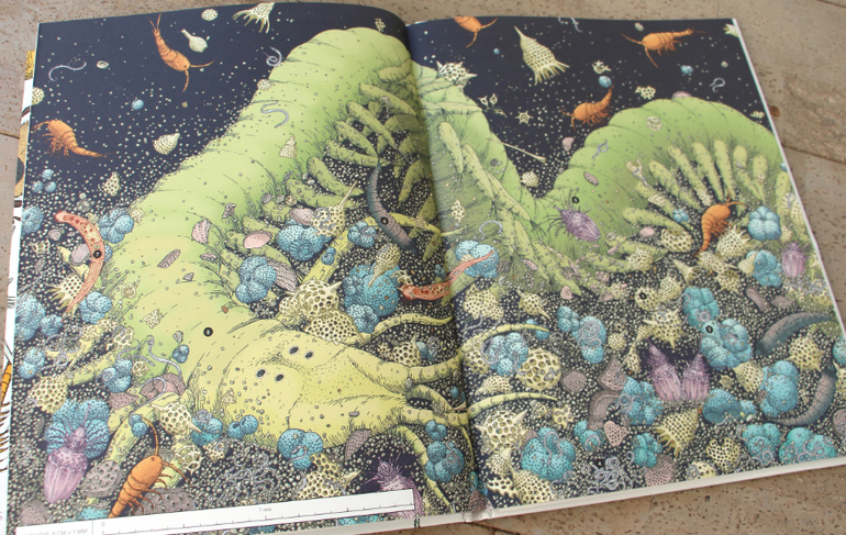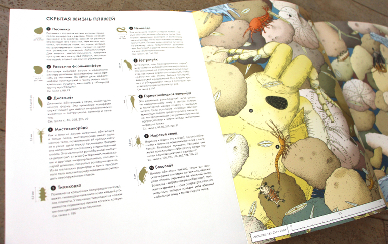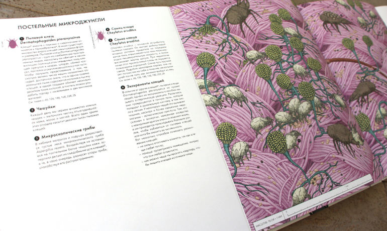 В книге мы рассматриваем под микроскопом капельки воды из рек и морей, частички с морского дна, леса и пляжа. Но самыми «страшными» и взрывными для мозга все равно становятся развороты с жизнью в наших постелях и кухнях, а еще на коже. Тут, не то слово, содрогаешься. А некоторые сведения становятся новостью - например, про угревую железницу я раньше не слышала. Покалывает, когда читаешь кто живет в твоей постели и чем/кем питается. И хочется срочно хватать тряпку и вычищать кухню - не дай бог, где-то крошки завалились.