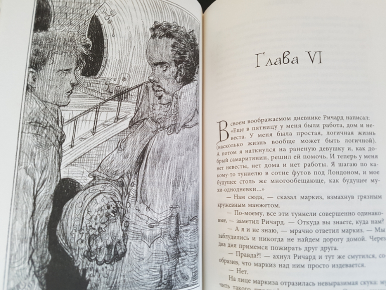 Никогде-это городское фэнтези, про другой мир, про задверье. Казалось бы ничего нового в этом жанре уже невозможно придумать, чтобы не повториться с ранее придуманным. Историй о попаданцах великое множество: Алиса,Нарния, Волшебник Изумрудного города(Страна Оз), мой любимый Джекоб Бесшабашный))) и т.д. Но Гейману удалось меня удивить, ничего подобного я раньше не читала. Мир Нижнего Лондона, в который попадают через городскую канализационную систему, населен странными существами. Крыситы, головорезы, черные монахи, ангел, монстры, вампиры и это только часть с кем пришлось встретится обычному клерку из Лондона Ричарду Мехью. После однообразной, размеренной жизни казалось бы он попал в ад, где на каждом шагу не просто опасность, а смертельная опасность. Кто друг, а кто враг никогда не понятно. Хочется очнуться от этого ужаса и просто вернутся к себе домой, но твой мир тебя не принимает, ты в нём уже никто, тебя в нём не существует, о тебе уже даже никто толком не помнит...