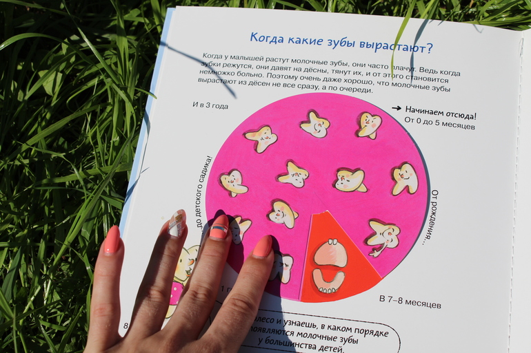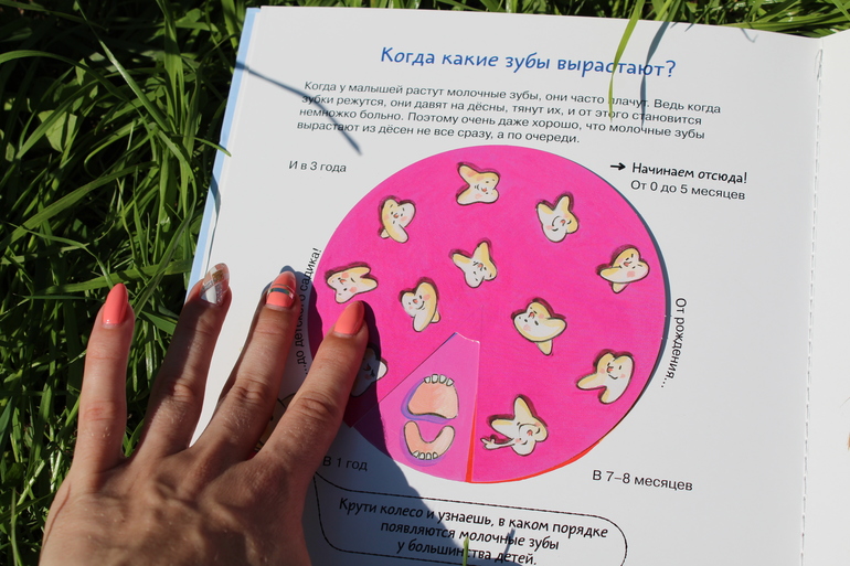 В целом книга действительно классная. Вряд можно раскрыть тему человеческих зубов более ёмко и креативно. По формату - квадратная картонка со множеством вставок и движущих элементов. Вот, например, колёсико, которое показывает, какие зубы на каком месяце у младенцев вырастают...