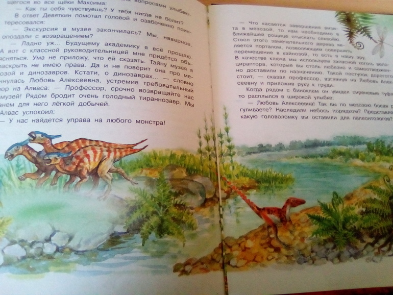 Филипп прочел книгу за три дня, это значит - что книга понравилась. Книга будет особенно интересна любителям динозавров, описано очень много их разновидностей и названий. История о том, как мальчик Максим Девяткин, ученик 5-го класса и профессор Александр Васильевич оказались в мезозое и наблюдали за динозаврами. Сама подача мне понравилась - в занимательной, приключенческой форме дети узнают много биологических фактов, размышляют вместе с главными героями о каких-то эволюционных закономерностях (напомнило "Необыкновенные приключения Карика и Вали). Иллюстрации хорошие, на каждой странице, книга очень красочная