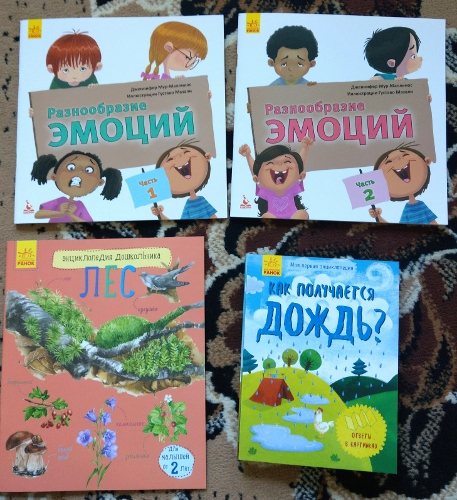 "Разнообразие эмоций" в двух частях. Тоненькие книжки про эмоции, к каждой картинка и обьяснение. Должна побуждать родителя и ребенка говорить об этом.