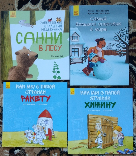 "Как мы с папой строили ракету" и "Как мы с папой строили хижину". Люблю книги такого формата, что-то уже есть подобное в коллекции, еще парочку взяла. Сын приходит к отцу и предлагает ему что-то построить вместе.