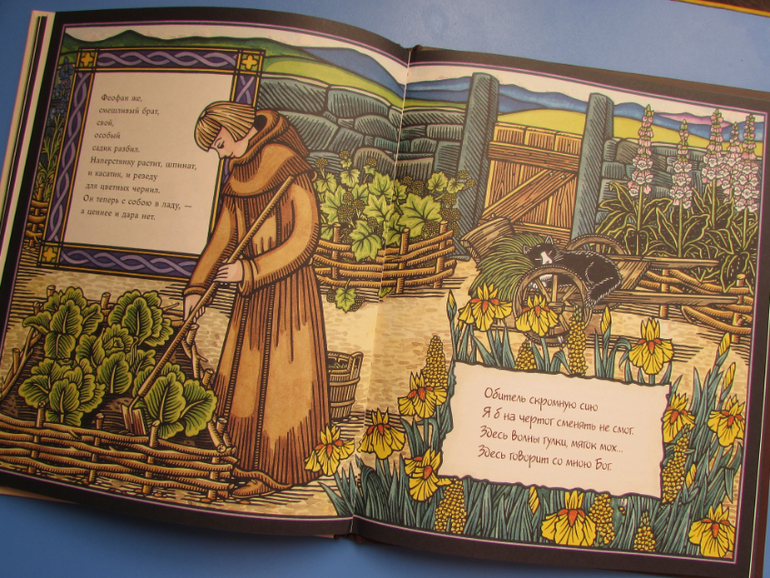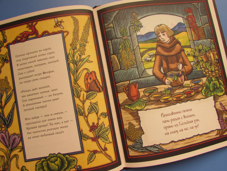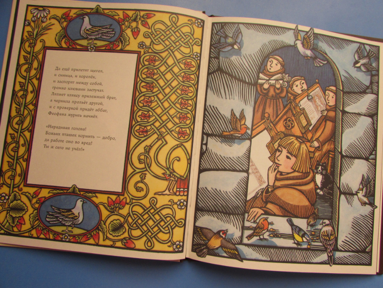 Феофану скучно переписывать книги. Ему хочется поглазеть в окошко, покормить птичек, побегать по зеленому лугу.